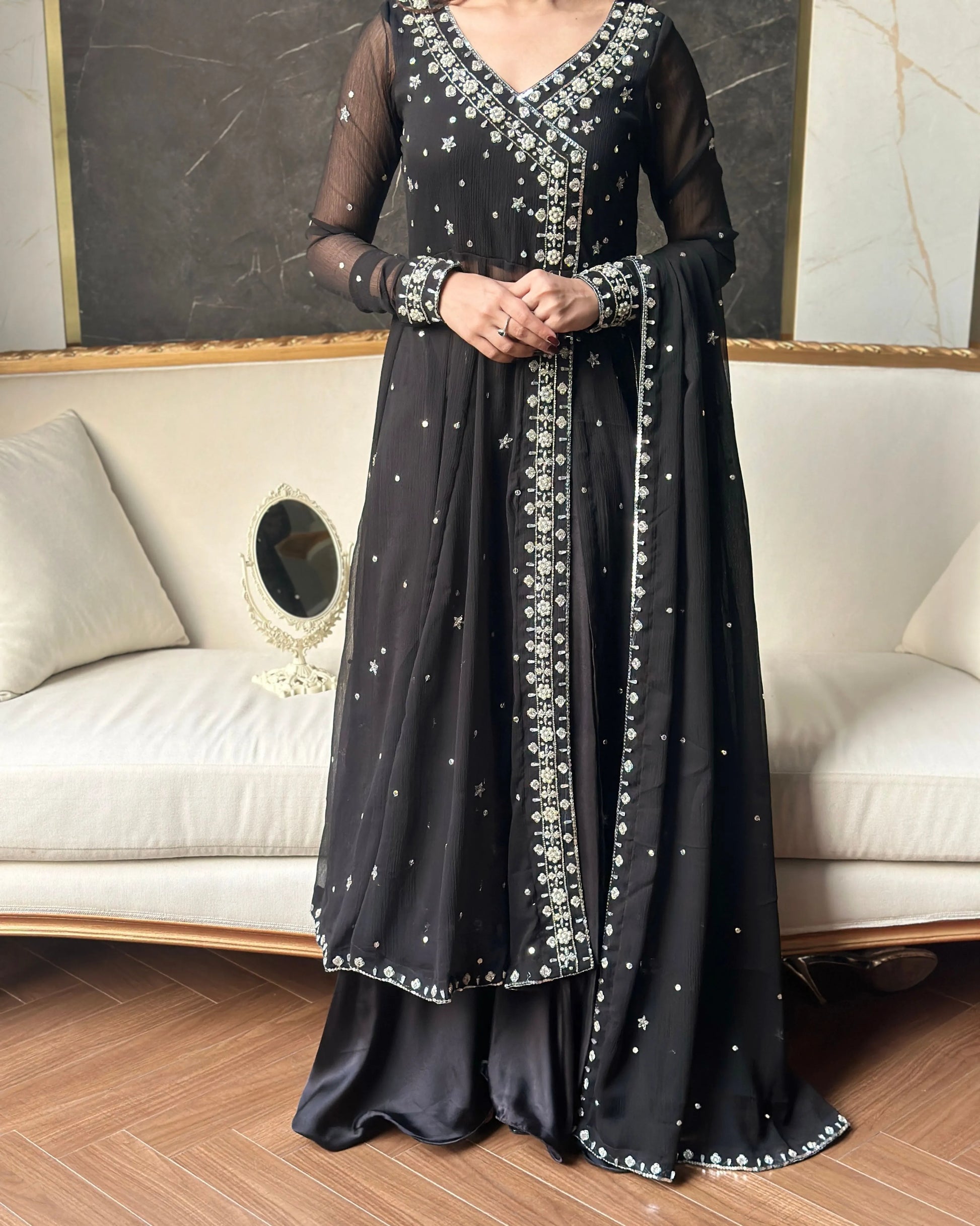 Step into timeless elegance with Afsana, a luxurious full heavy Andrakha-style khalidar designed for festive and wedding occasions. Featuring exquisite handwork all over the body, flare, and dupatta, this heavily flared outfit radiates sophistication and grace. Paired with a delicate hand-embellished chiffon dupatta and Sheesha Silk heavy flared plazo pants, Andrakha perfectly blends traditional craftsmanship with modern refinement. Ideal for weddings, receptions, and festive celebrations.