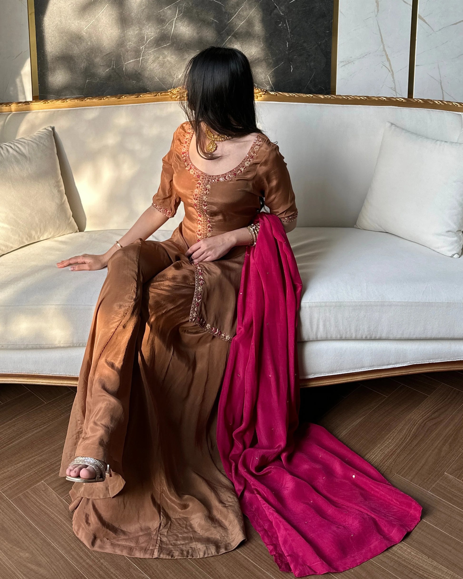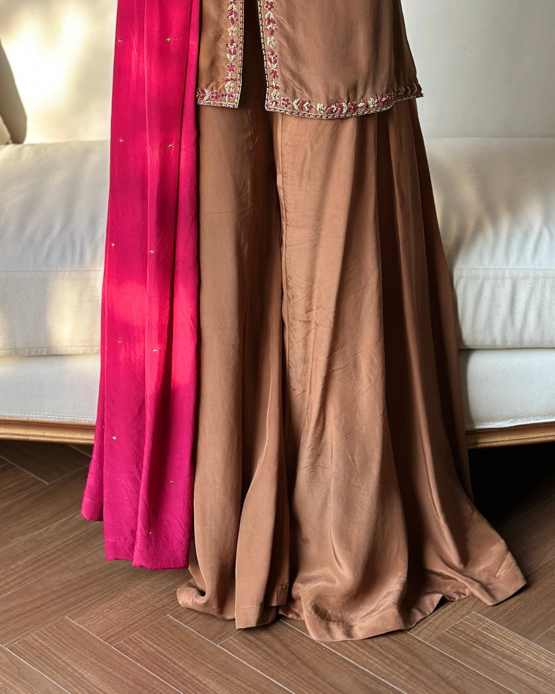 Premium Fabric: Sheesha Silk Short Open Shirt with Handwork | Flared Sheesha Silk Plazo Pants | Contrasting Pink Sheesha Silk Dupatta with Chhan