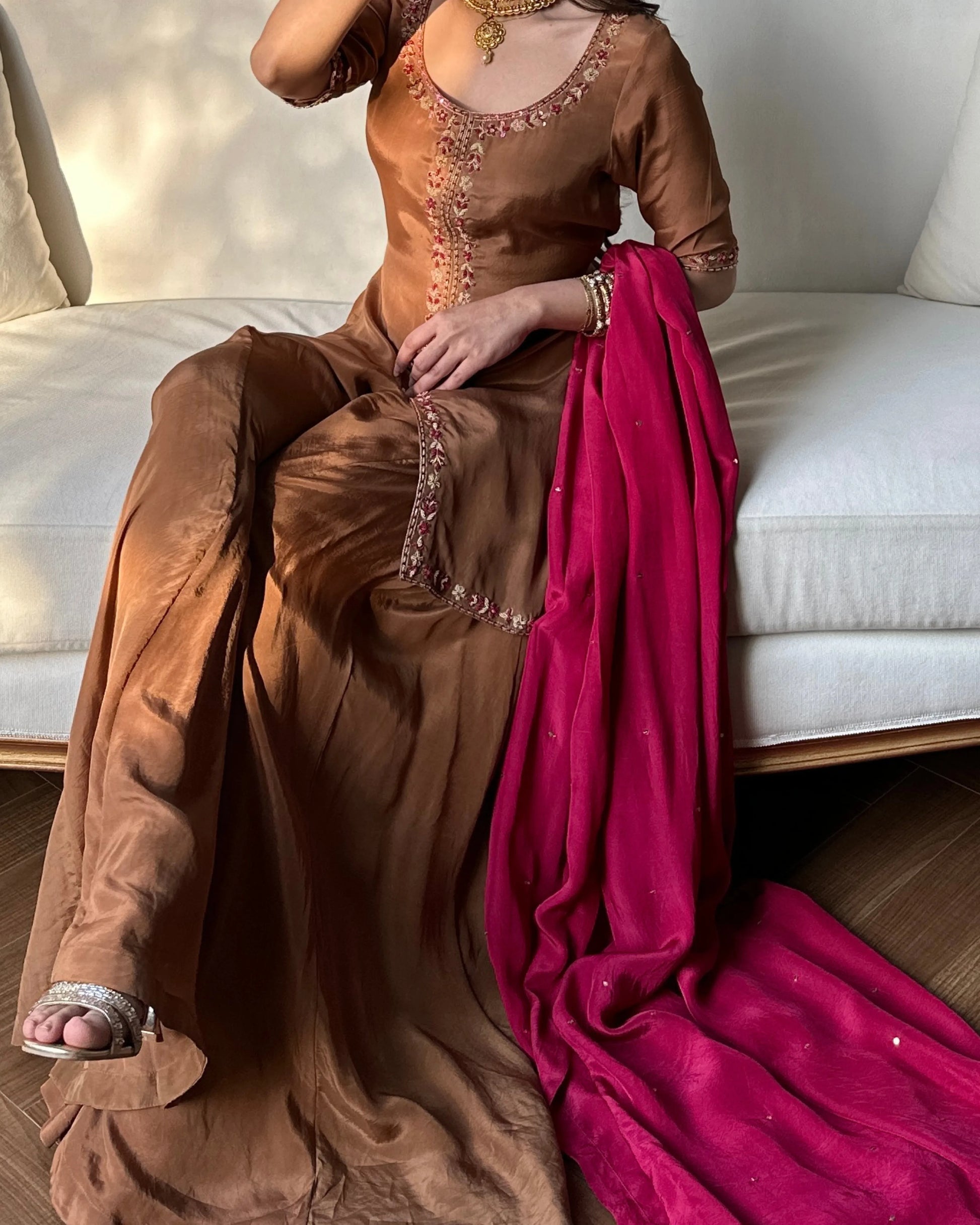 Step into floral grace with Gulerukh, a Sheesha Silk ensemble designed for festive moments and intimate celebrations. The short open shirt is adorned with delicate handwork, creating an elegant silhouette that pairs beautifully with flared plazo pants for effortless movement. Completing the look is a contrasting pink Sheesha silk dupatta, finished with soft chhan detailing that adds a romantic, feminine touch. Gulerukh captures timeless beauty, subtle luxury, and shehzadi charm in every detail.