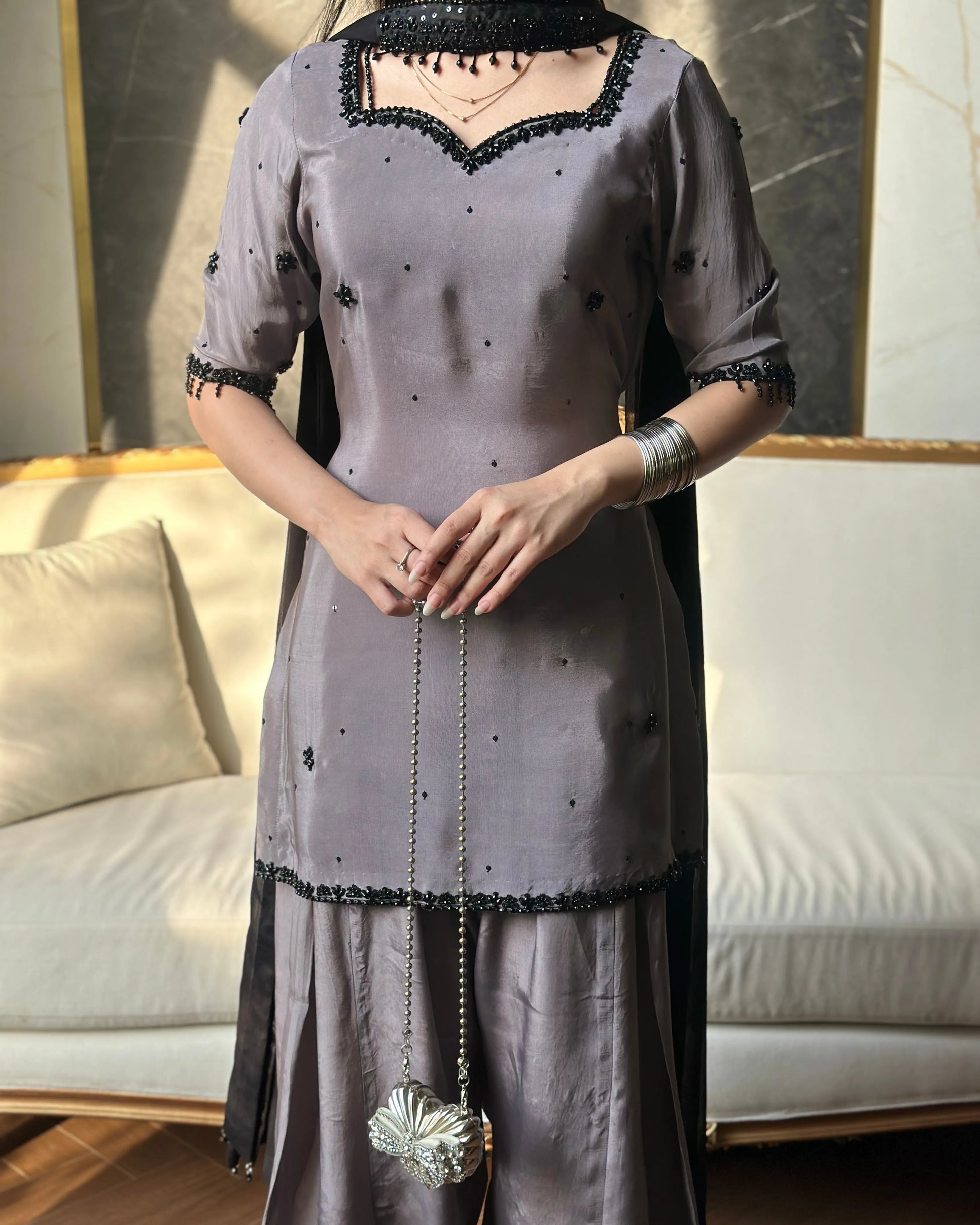 Discover timeless luxury with Husn, a premium festive ensemble crafted for women who love elegant Pakistani designer wear. This refined outfit features grey sheesha silk adorned with black handworked booti detailing on the neckline and daman, creating a striking yet graceful contrast. The look is paired with a sheesha silk farshi shalwar for a regal, flowing silhouette, while a black long dupatta with delicate handwork completes the ensemble with effortless sophistication. Perfect for Ramadan gatherings, Eid dawats, festive dinners, and Eid parties, Husn is designed for women who appreciate comfort, craftsmanship, and understated glamour.