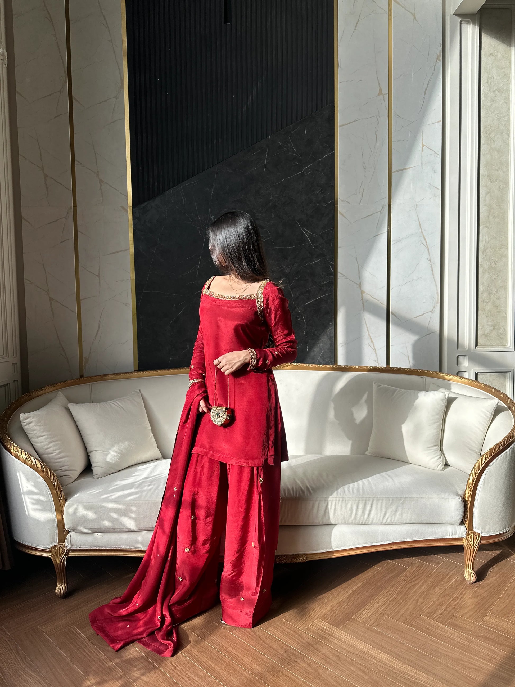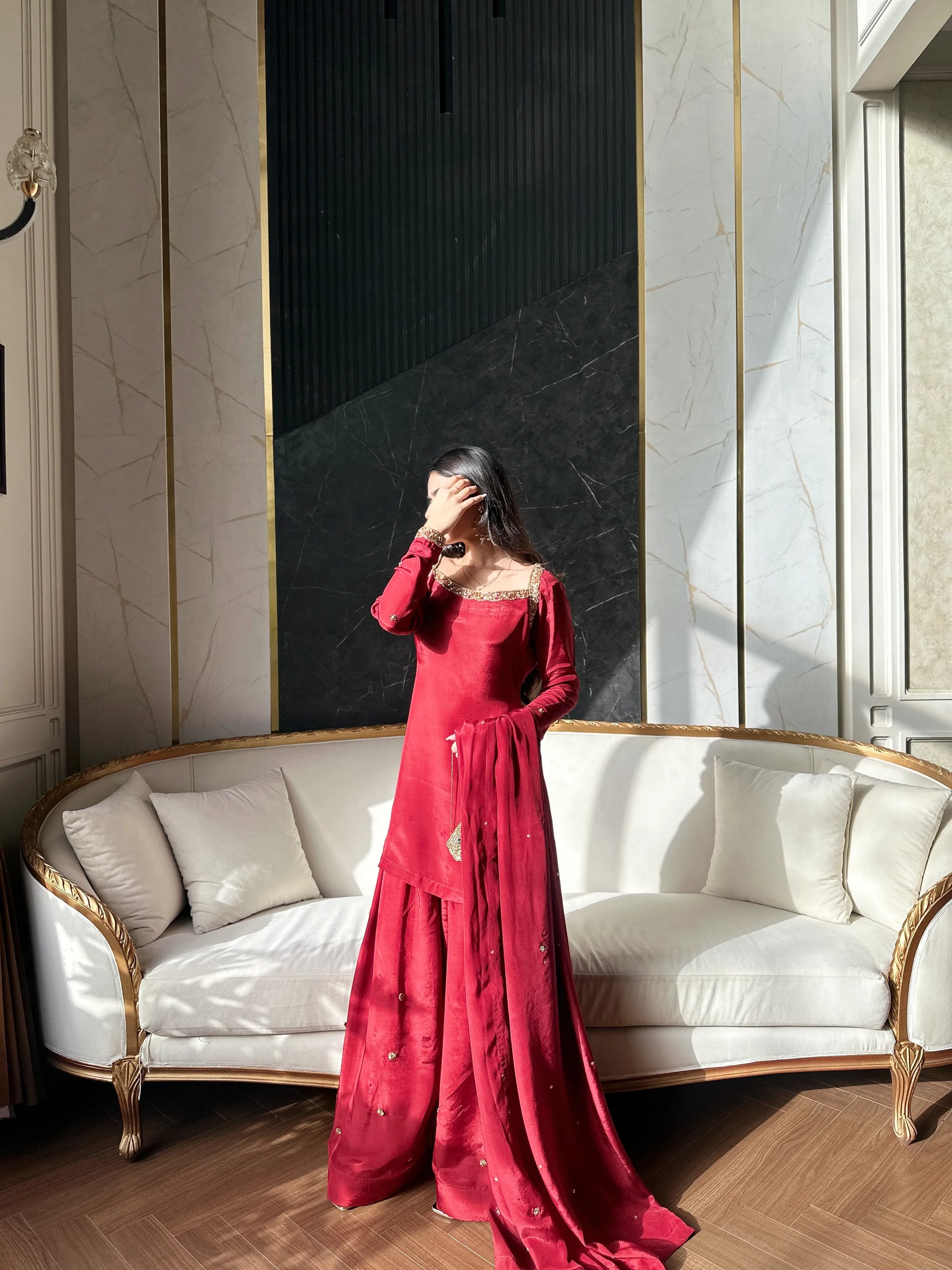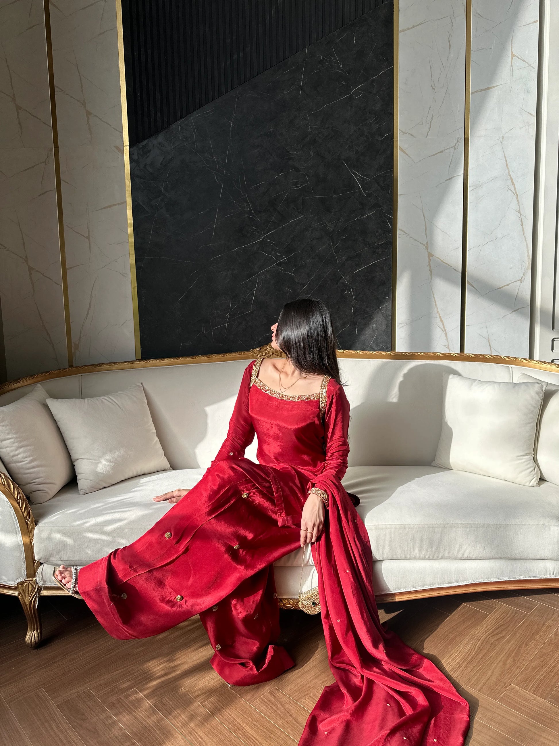 Premium Fabric: Sheesha Silk with Handworked Neck | Sheesha Silk Dupatta with Chhan | Farshi Shalwar with Work