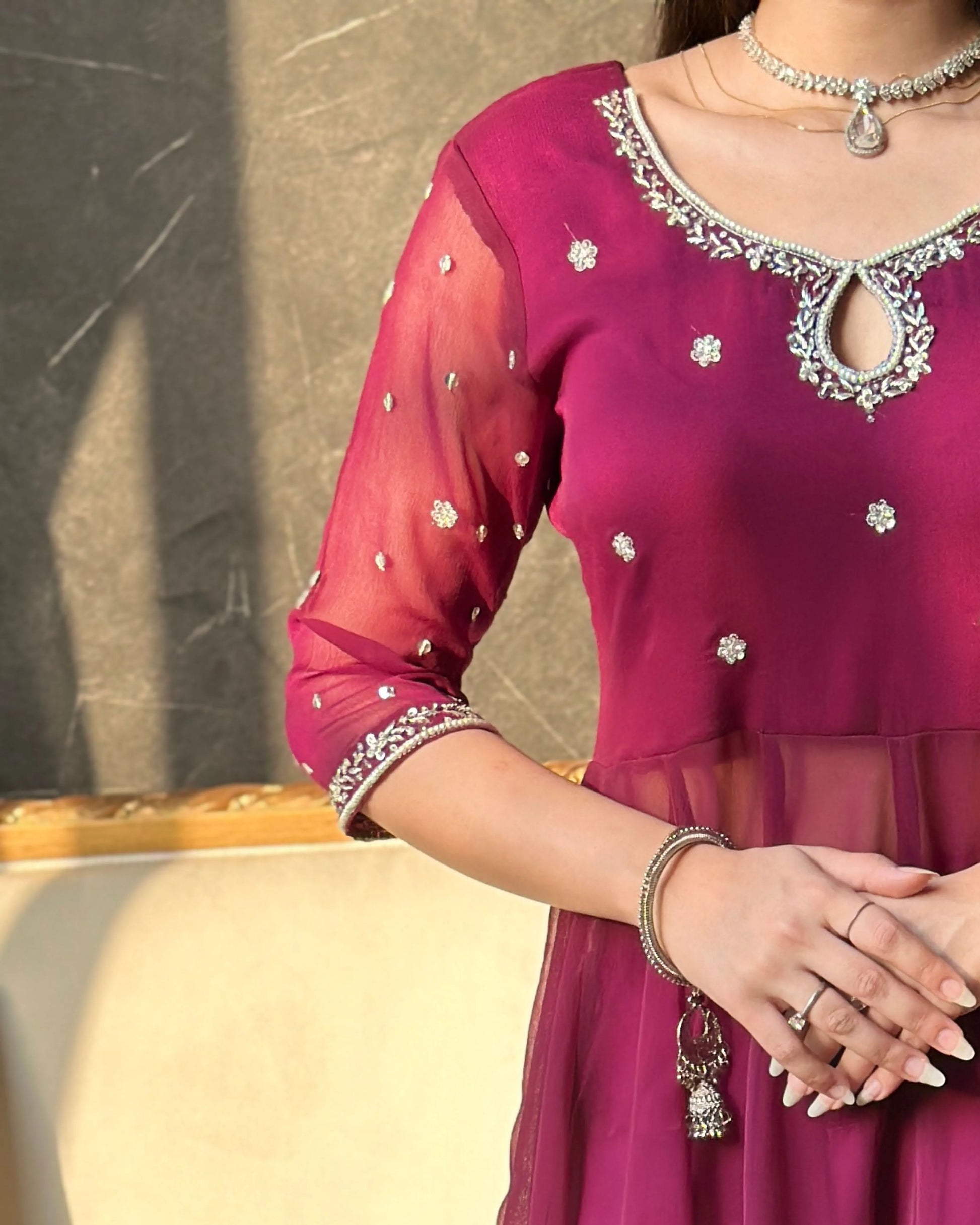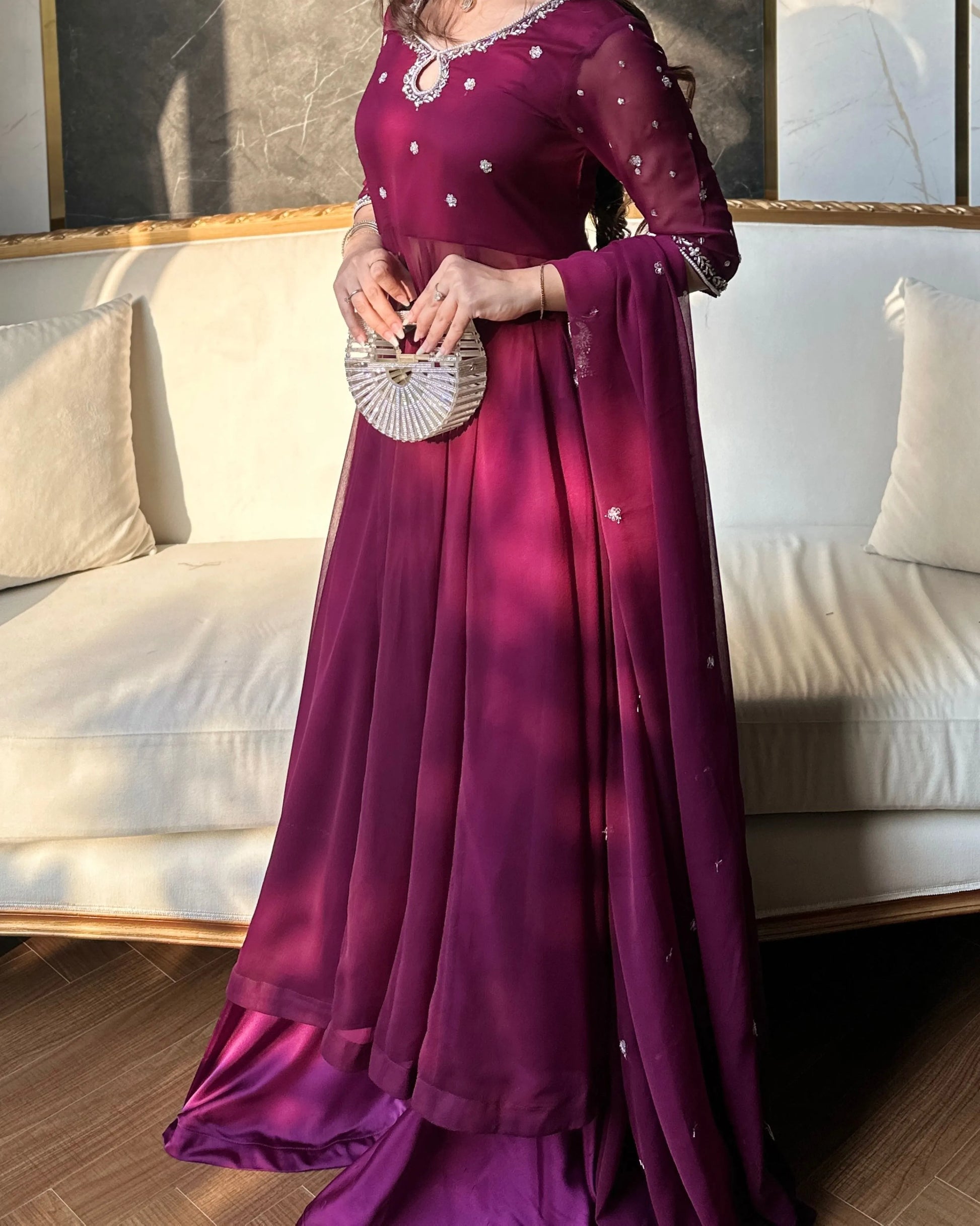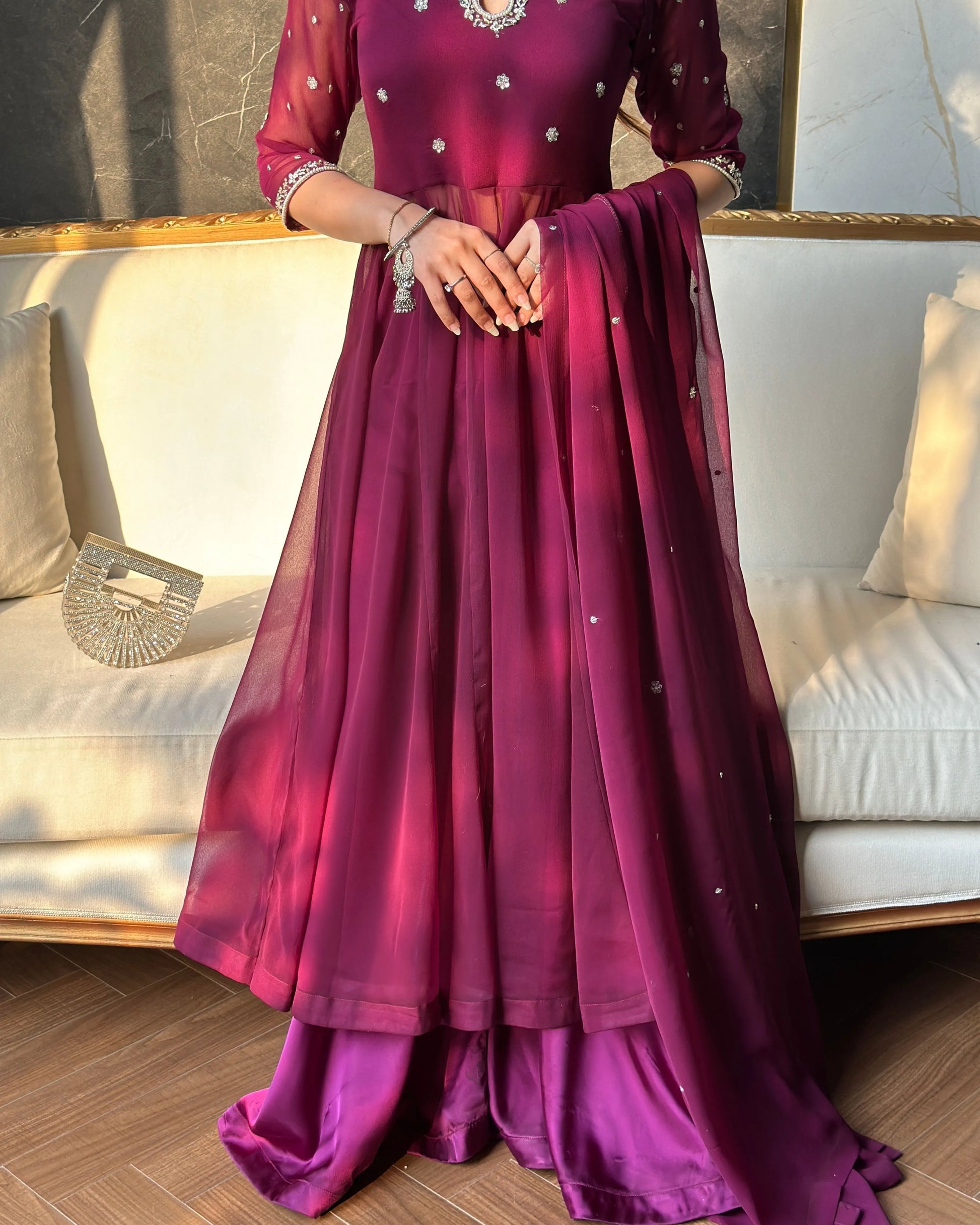 Premium Fabric: Chiffon Khalidar with Handwork on Neck, Body & Sleeves | Chiffon Dupatta | Sheesha Silk Plazo Pants