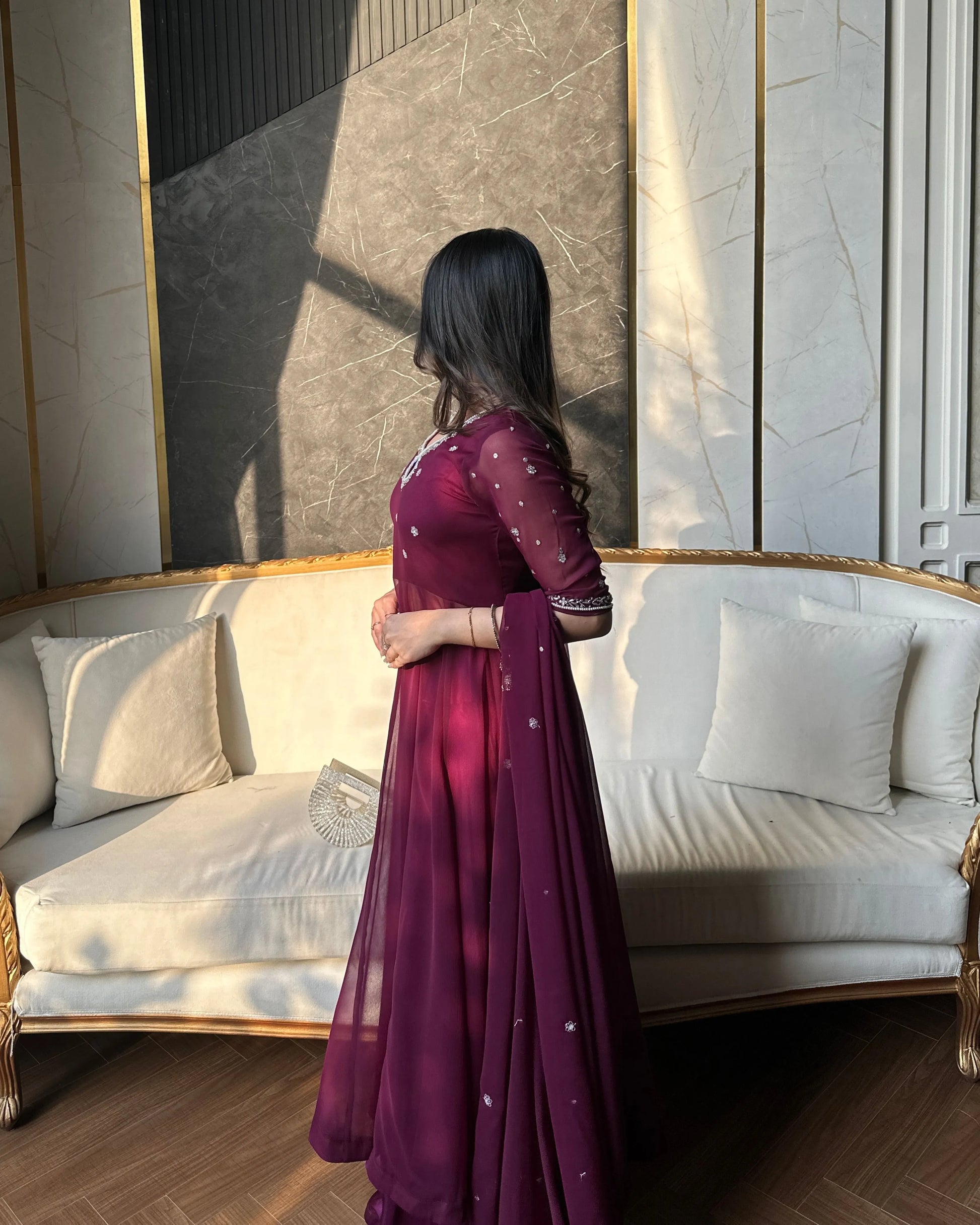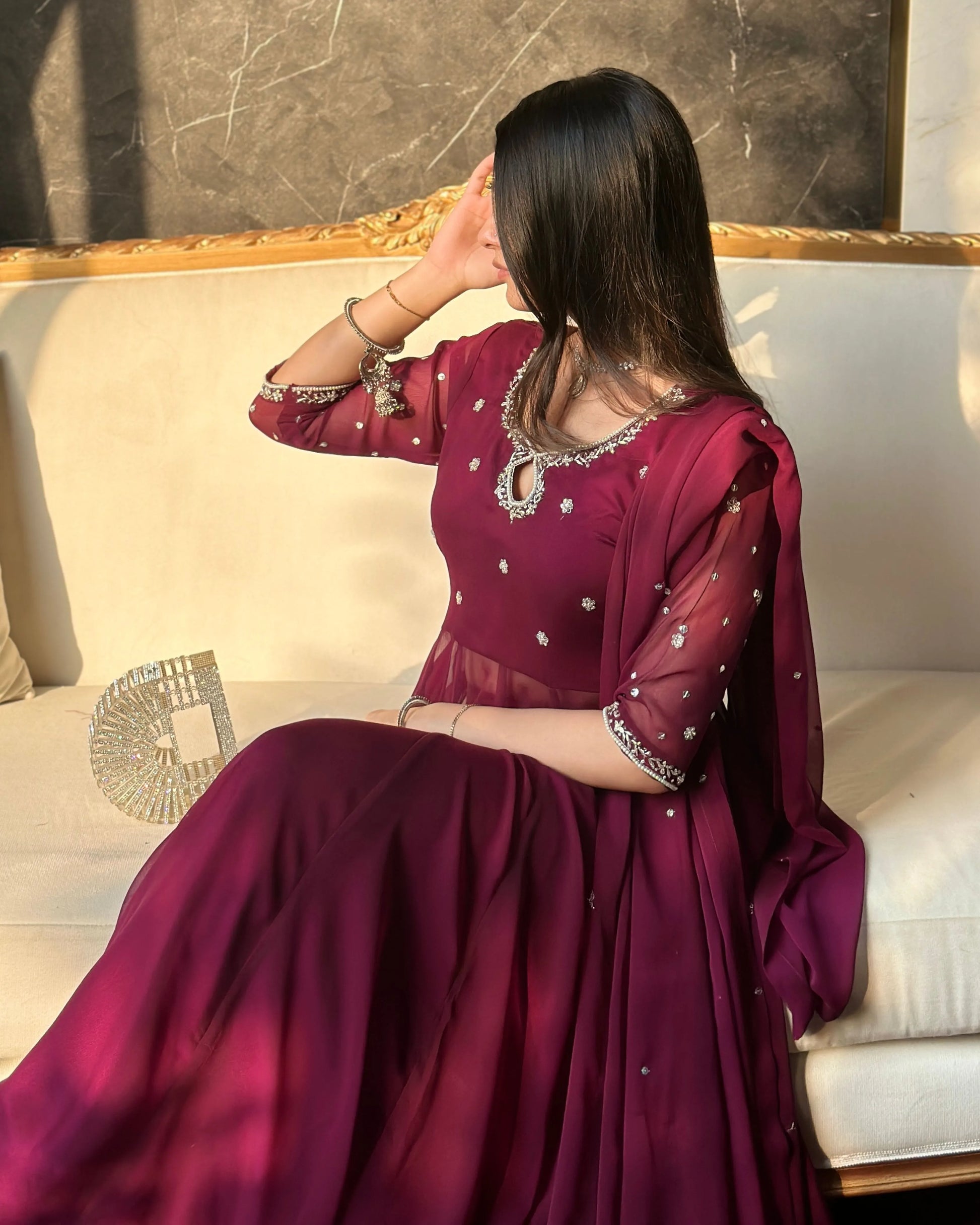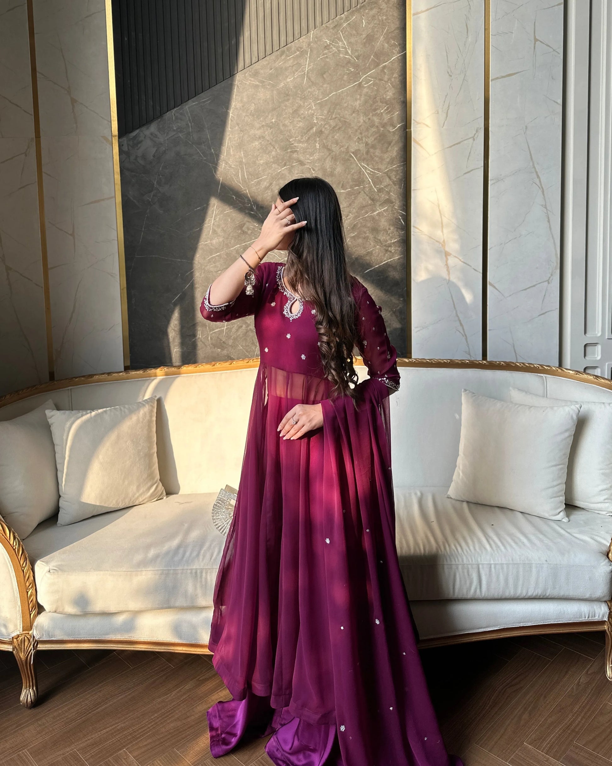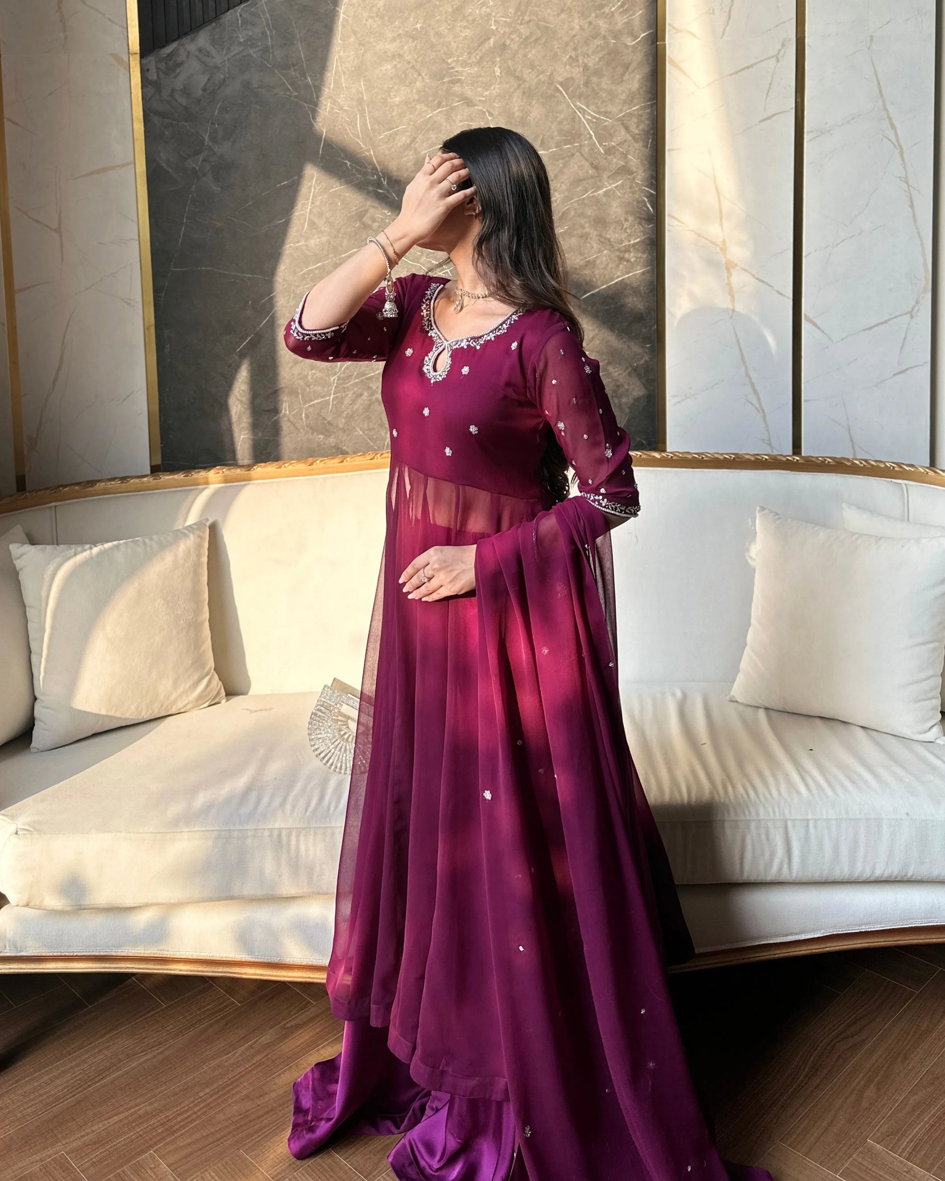 Premium Fabric: Chiffon Khalidar with Handwork on Neck, Body & Sleeves | Chiffon Dupatta | Sheesha Silk Plazo Pants